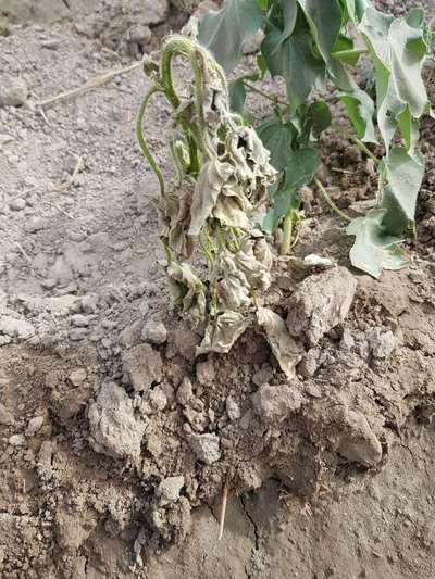 Hi Shah Mohammad Khuhro i gues this is Fusarium Wilt of cotton for better control use aliette of bayer its a good product for all soil borne disease or coppor oxychloride also work in this but as a prevention you have to give it chloropyriphos also in flood for any roots insect like termites root borer etc hope it will help you