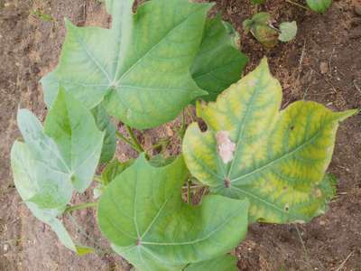 Yellowish discolouration of leaves from margi s sparing area around veins in 45 days old cotton crop