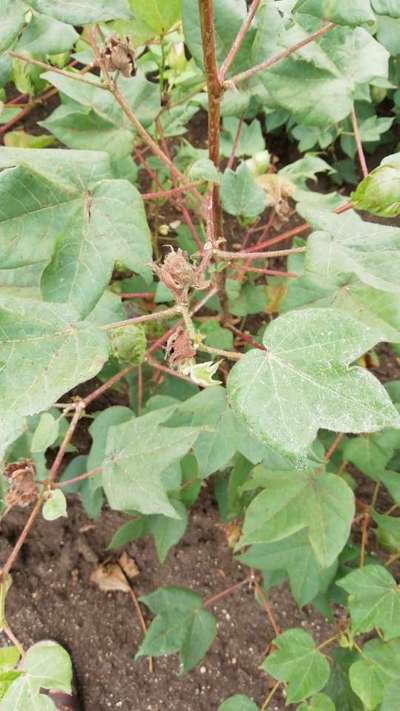 Hi Sandy . Lets open and see any attack of insects on and in flowers and bells. As per your sent image- I suspect, it showing symptoms of Anthracnose of Cotton . For more details, you are requested to click on green link for knowing symptoms and taking control measures from Plantix library. Also use fertilizer calculater, crop Advisory, see all tasks and weather report sections available here on home page of Plantix.