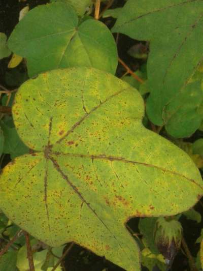 Brownish leaf spots on leaves and bolls . Some leaves are yellow.. branches are damaged by heavy rainfall and some plants are logged and square are drop down... Jassids are also on plants .