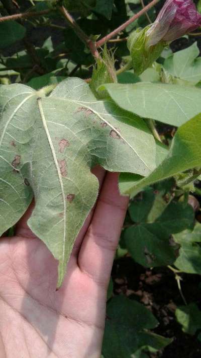 Hi Khushal Varsani. Your Cotton crop is suffering from Anthracnose of Cotton and Leaf Miner Flies . Also check for Cotton Leafhopper Jassids effect too by clicking on green links given here for knowing symptoms and taking control measures from Plantix library. Also use fertilizer calculater, crop Advisory, see all tasks and weather report sections available here on home page of Plantix to increase your crop productivity.