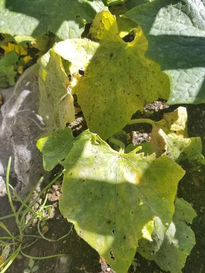 It was planted from seed and is growing wonderfully. Its sprawling. It has grown over two other pickling cucumber plants and produced 4 fruits already but the leaves are discolored and getting eaten by something . What can I do ?