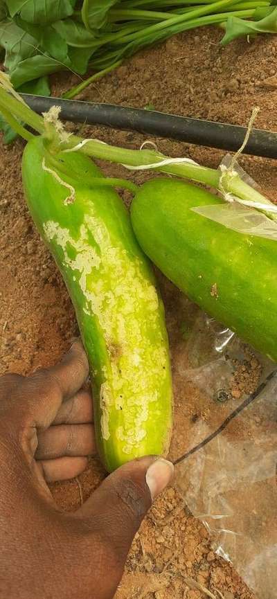 Hi Subramanyam . I think your cucumber plant is expected by Leaf Miner Flies and defoliated of plant leaves leads to sunburn of fruits. For control measures click on green link to know symptoms and taking control measures from Plantix library. And due to touching of your cucumber fruits to ground, might be showing rotting symptoms as shown in picture, it's called fruit rot/Belly rot of cucumber, caused by Rhizoctonia solani. Control measures: 1. Use plastic mulch to create a barrier between fruit and soil 2. Plant in sites with good drainage to avoid wet soils 3. Apply appropriate protective fungicides when plants begin to climbing like Captan, 4. Provide stick support to climb vine Carbendazim at 3grms/ lit of water. Thanks for visiting.