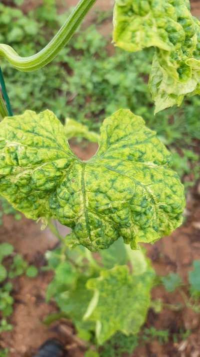 Crop name is ridge gouard and middle leaf's are affected and looks like the above image.can some one please give me solution for this problem.