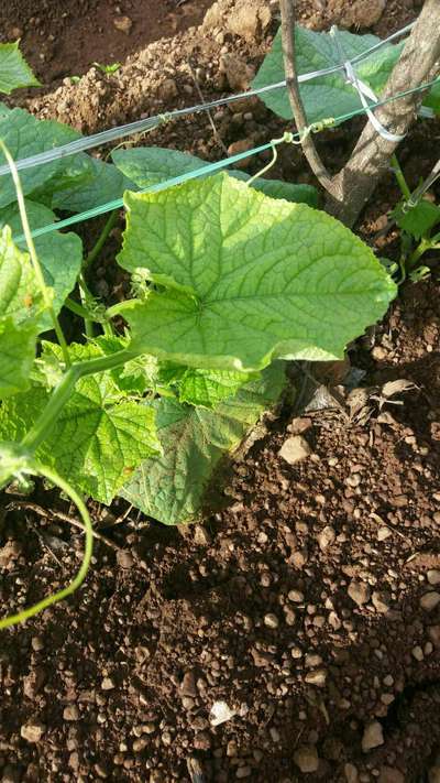 It was planted from seed and is growing wonderfully. Its sprawling. It has grown over two other pickling cucumber plants and produced 4 fruits already but the leaves are discolored and getting eaten by something . What can I do ?