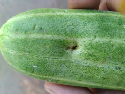 Small hole made by insects or worm on cucumber fruits. What kind of disease is this and what is prevention method by chemically or biologically? Also tell brand name of the pesticide orinsecticide