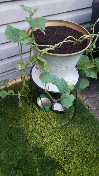 Hello Erica Hall, The compost alone is not the optimum growing media for cucumber roots. Pls remove some compost about 2 cm deep from the upper surface and add sands about 3 cm and use a stick to bore or make perforations about 8 to 10 holes up to bottom so as to ease sand particles move or travel down with irrigation water. The sand stabilizes optimum pH for the growing media that cucumber roots love. Try to keep it a bit acidic other than alkaline in properties. The the compost containing cow urine or cowdung or vermicompost or tricho-compost etc are ideal for cucumber roots. Ck in Plantix library by clicking on Gummy Stem Blight of Cucurbits if your plant is yet in save side from this deadly disease.
