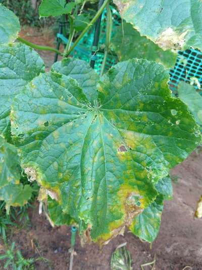 Hello Jessica Junlee Yeah agreed with diagnosis by Suresh Gollar sir Your cucumber plant is affected by Downy Mildew of Cucurbits Quick solution: Go for application of 👉Azoxystrobin 23%SC And you can also add some Epsom salt plus boron for more fruits.
