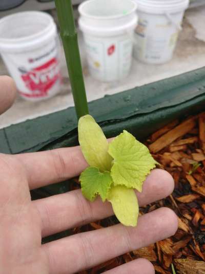 Can you help me identify the problem? I've fertilized this cuke seedling but it still looks like it needs nutrients, its stunted at this stage too.