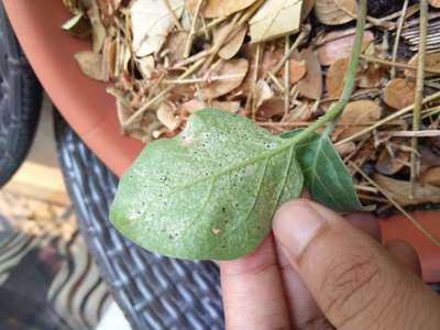 So we got this brinjal sapling a few days ago. It started drooping and one leaf even wilted and fell off. The underside has these black looking spots with some white looking stuff.