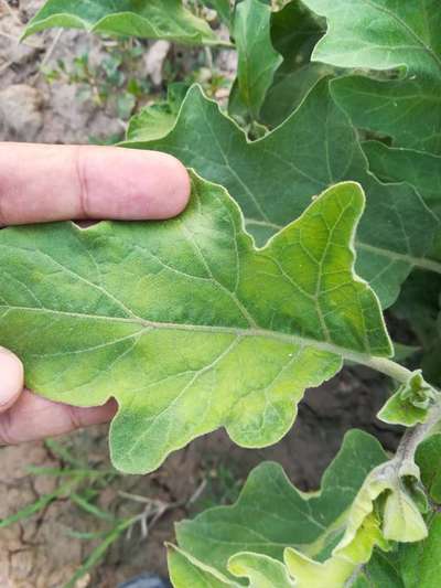 Basit Khan As the young terminal leaves showing yellowing and chlorotic appearance, there's is some chance of Iron Deficiency. Besides, pls have a look also on Nitrogen Deficiency, but there's a little chance of being associated with virus disease in eggplant.