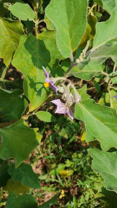 The brinjal crop affected with disease or any nutrient deficiencies.