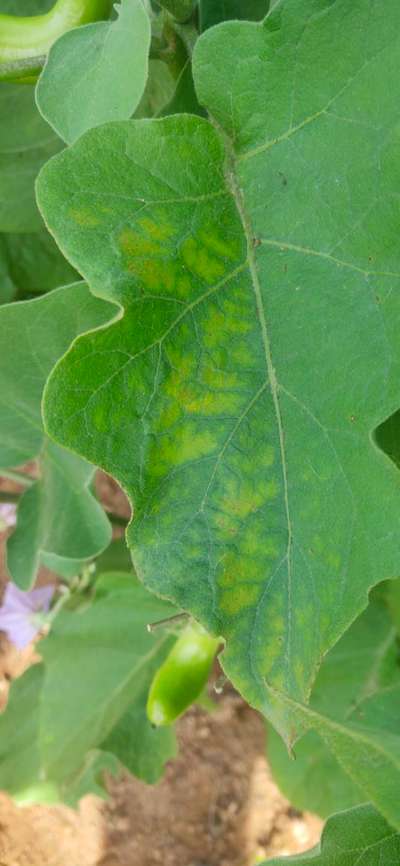 Hi Ganesh . It seems to be like Magnesium Deficiency . Click on green link for checking symptoms and taking control measures from Plantix library. Also need to apply good amount of Farm Yard manure or Vermicompost along with recommended dosage of fertilizers of your area. Or you can also use fertilizer calculater available here on home page of Plantix to increase your crop productivity. Apart, you can also use and create a "Cultivation Tips" for Brinjal in Plantix. It provides you information on how to optimize your crop production.