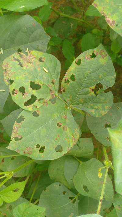 Learn more about PlantixLarge hole on leaf and brant like spot seen