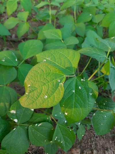 the above shown blackgram plants were planted below fully grown trees as intercrop. They were seeded 30 days before, now new flowers starts to bloom. the white spot on leaves are only in certain areas, not throughout the field. Insecticide - alika and booster - Isabion were sprayed 5 days before