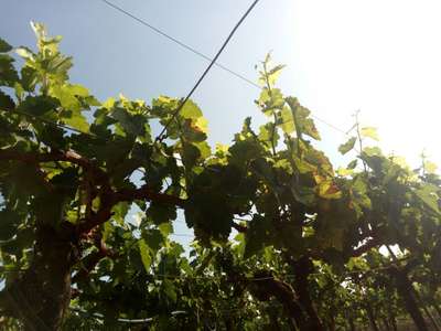 Sudarshan Can you pls capture a picture alongside of your infested grapes vine stem where you found fecal matters and wood excreta for wood borer? According to me your plant is also suffering from a leaf disease like Downy Mildew of Grape. If you click on the green hyperlink that takes you to plantix library where you can review details on this disease and compare, or take appropriate control measures together.