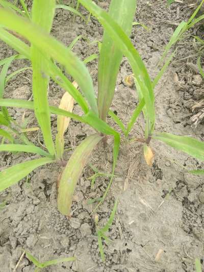 White elongated patches on Seedling stage of maize crop, and also there is a presence of 'pacha purugu ' (telugu).