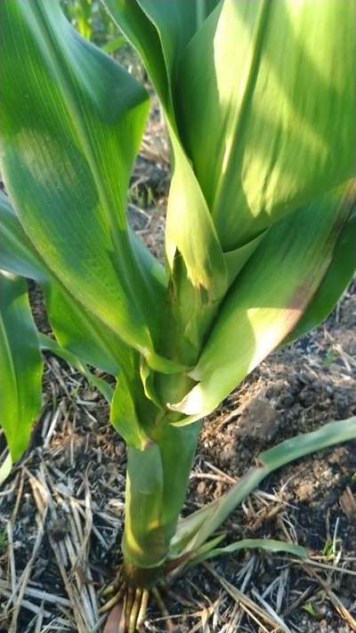 It seems your crop is attacked by fall army worm. Spray coragen or any equivalent insceticide. Also take a spray of tonic for faster growth. Or give sufficient amount of been coated urea