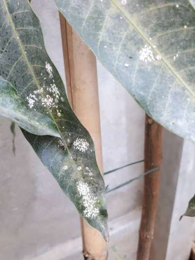 I am seeing this colony of some insect eggs or bug itself I don't know. I would like to know more as to what my kesar mango plant is suffering from and how to cure it. I have used thiamy... something spray on leaves but still it is not going.
