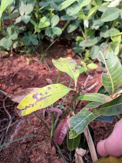Hi, this a mango sapling that is just 6 months old. There are some dark patches and holes on the leaves. Kindly guide me how to resolve the issue!!