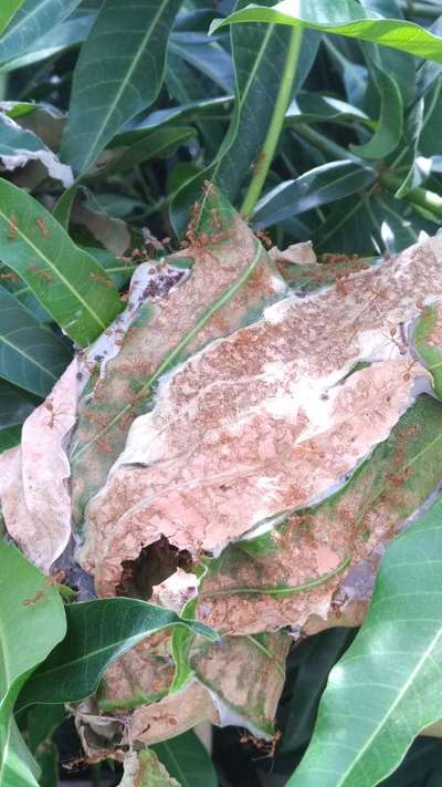 Hussain K This is because of ants it will web mango leafs and creat one antweb, ants are not major problem and even they don't have any influence on crop yield or anything. But web created by ants will become hosting site for mango leaf Webber I.e. Orthaga spp. So pls remove the ant webs or go for smoke application in case notice of any leaf Webber in that colony go for control measures:- Spray acephate 2g/l or diclorovos 2ml/l.