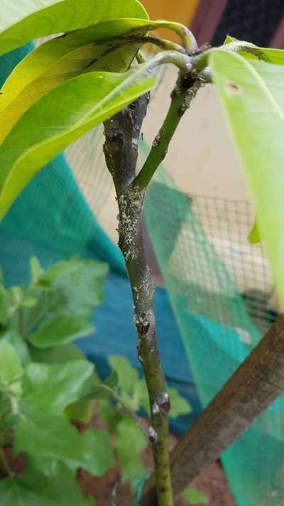 This mango tree every time I have plant this but not grow up because of some white layer form on the branches and day by day Leaf are falling down plz tell me solution to protect my mango plant
