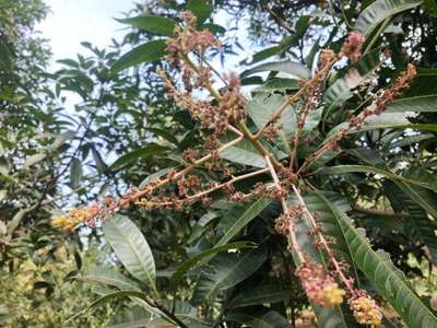 Ramesh do you notice any powdery substance in this mango penicle. If yes then ur crops is suffering from mango powdery mildew disease & it's a fungal disease , no insecticide will help u in such case. You need to use Fungicide. However some times high temperature also destroy flowers. Make inspection of the tree and check for powdery substance as I said earlier & let me know.