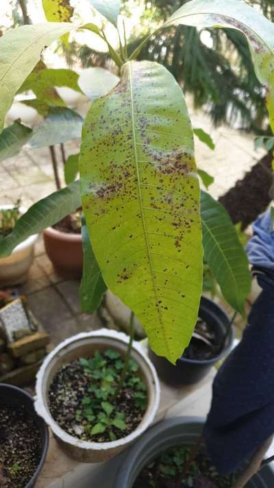 Small to medium sized brown to black spots on leaves and even the branches of Mango plant in pot