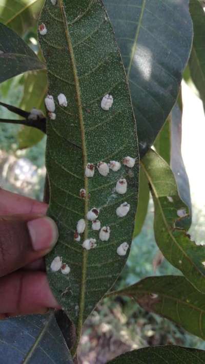 Hi...to community.am new to this.recently (july month)we planted mango ..In 4 acres.now we are observing leaves are like this.and insects also shown in photo.please give proper solutions and medicine for this.