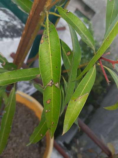 4 pictures attached please check all Please check the problem with mango tree, something wrong with leaves and plant not giving new branches and leaves. Treatment given till now by me:- 1) added cow dung compost. 2) given wood ash. 3) neem leaves spray given 3 times. Neem leaves boiled in water with garlic and its spray was given also neem cake was dissolved in water for 3 days and its spray was given. #Bacterial Black Spot of Mango #mango @Suresh Gollar