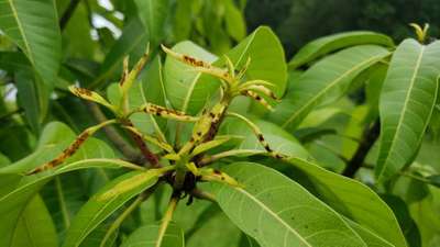 New flush on Mango Tree has brown on tiny leaves and stops new growth. This same tree has healthy flushes at same time.