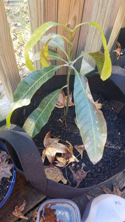 Not sure what's wrong with the baby mango tree. Leaves started getting spotted brown and feels dry and crisp. Also looks a weird milky white between stem and trunk. Not sure if that's anything. Was thinking maybe powdery mildew but not sure.
