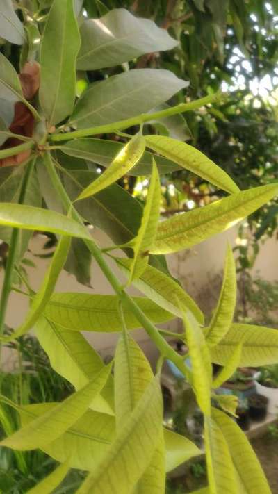 Hi Satbir Dalal . It looks like Iron Deficiency . Click on green link for checking symptoms and taking control measures from Plantix library. Also need to apply good amount of Farm Yard manure or Vermicompost or any compost once in 6 months along with 19:19:19 complex fertilizers to get good growth. Or you can apply recommended dosage of fertilizers according to your area or you can also use fertilizer calculater available here on home page of Plantix to get good growth and productivity. Try well and take care of your Mango plant please.