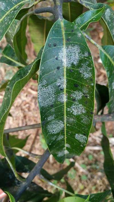 The leaves of the mango tree have a white coating, some mangoes also show this . Please suggest a remedy for this desease.