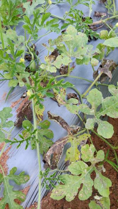 The melon is of 50 days old and there are reproductive stage has just begun. The plant has already affected by stem rot and has been treated with thiophanate methyl. As days pass by, more leaves are turning as in the picture. Help me with treating this.
