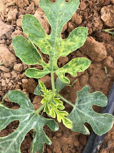 Hi Suonn Samrach. It looks like Watermelon Mosaic Virus . This disease transmits through vectors like Aphids . Control vectors to control this disease. So, click on green links for checking symptoms and taking control measures from Plantix library.