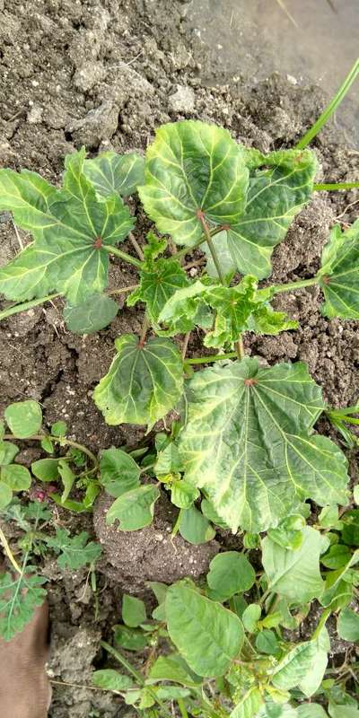 Colour of leaves has changed drastically. White spots and marking are seen on leaves.. Small white dots are seen behind the leaves.. And small white bugs also.. This plant is Ladyfinger. (BHINDI)