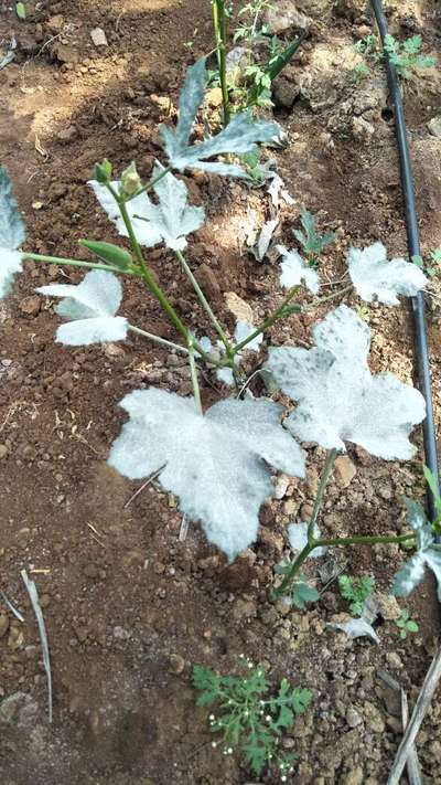 Ladys finger crop after having encounter fertilizer it gets white layered and affects the growth of plant kindly suggest me ideas to yield better
