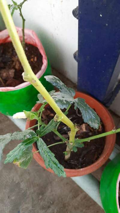 Hi Dhivya. Ok. As per your sent image, I don't see any major problems, it seems. No need to cut stem at this stage. Just check symptoms with Powdery Mildew by clicking on green link for taking control measures from Plantix library. Care: Don't do overwatering and direct watering on plant. Apply good amount of Farm Yard manure or Vermicompost. Make small holes below the pot to drain out excessive water from the pot. Ensure adequate sunlight to get good growth of your okra plants. Try well and take care of your plants please.