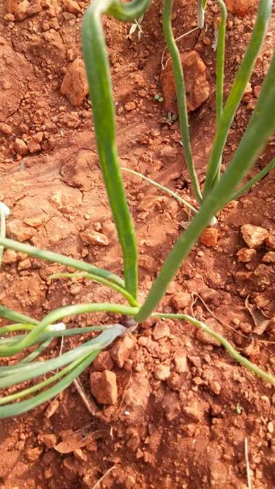 The leaves of onion crop for seeds are bending downwards and appear pale