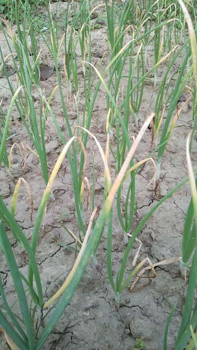 Tips of the leaves of onion plants growing yellow.