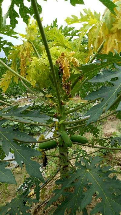 Papaya stem looks loke snake pattern , there are many black mark on stem. The growth of papaya plant stopped and its leaves growth also stopped