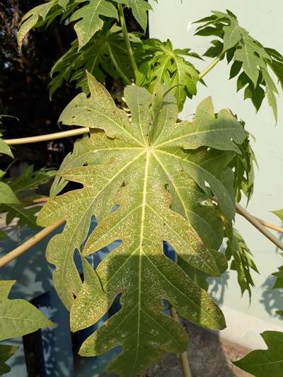 Learn more about Plantixপেপে গাছের পাতাগুলোর মধ্যে সাদা বর্ণের ছিট ছিট আর পাতাগুলা হলুদ বর্ণ হয়ে যাচ্ছে,,,