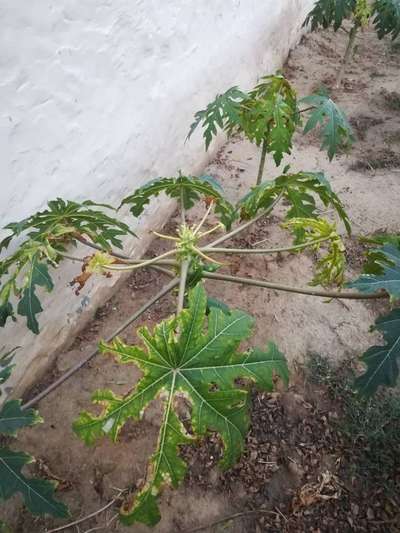 Hi. This is 1.5 years old Seedless Papaya Tree planted in Ludhiana Punjab. Please help me to identify the problem and treat it. It was so beautiful and full of very large lush green leaves but, since last month its leaves are changing color and finally they shed off. Its canopy has reduced a lot due to loss of leaves. A month ago I noticed something like worms on its going to ripe fruits which were fixed as they were fixed with fevicol ! But they were not worms I think and now it is alright without any medication. Please guide.