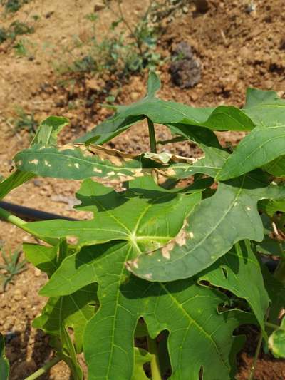 Learn more about Plantix30 days after plantation. Papaya red lady. What is causing that? (There are two plants in the same pit, probably saplings came like that)
