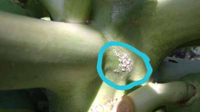 The stem part or the branch part shown red and white colour, the petiole show some pink scar. Is this due to fungus?insect bite? Some part also shown necrosis tissue. Recently there is heavy rain.