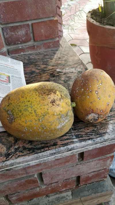 White spots and black Powder on fruit of papaya . Fruit rotting from base on right papaya shown.