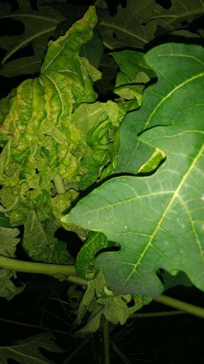 Hi Sartaaj Shaikh . As per your sent image, your papaya crop is severely effected by Papaya Leaf Curl Virus disease. This disease transmits through vectors like Whiteflies . Lets you try to control vectors to control this disease. Click on green link for checking symptoms and taking control measures from Plantix library.
