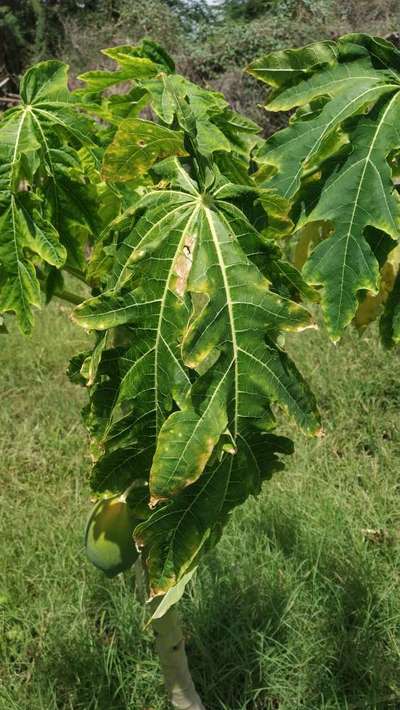 Hi Shashi. Compare symptoms with Papaya Brown Spot and Papaya Mosaic Virus by clicking on green links for checking symptoms and taking control measures from Plantix library.