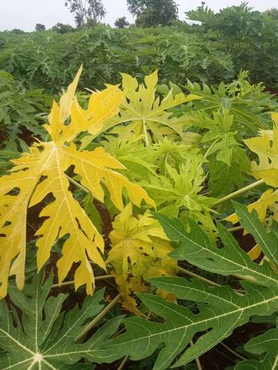 Hi Bk . Hope you are well. Regarding your papaya - Have you checked presence of Whiteflies and Aphids at the backside of the plant leaves. Because it's showing similar symptoms of Ring Spot Virus, Papaya Mosaic Virus. Yellow color of plant might be due to Iron Deficiency and Nitrogen Deficiency . Click on green links given here for checking symptoms and taking control measures from Plantix library, so that, your crop will improve immediately. Otherwise spread of disease is very faster rate and entire crop might reach to non recoverable stage. Hence take care of your crop immediately. Note: effected plants, cut slowly at the base, take out from the field and Burn them immediately.